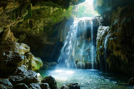 Sunny day photo high quality image of cave waterfall and underground river in a scenic setting
