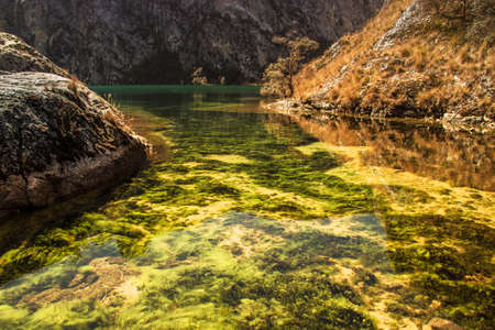 Clear water lake in the mountain with bottom full of vegetation, moss and seaweed.