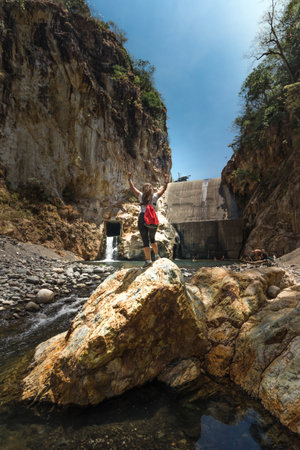 vertical shot of a female hiker with a backpack posing with her arms up in front of a dam in the riverbed on a hot sunny day in the province of Puntarenas in Costa Rica
