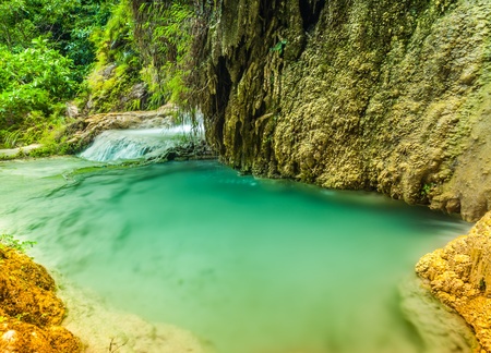 Beautiful tropical waterfall. Thin streams flow down the mossy wet slopes into the lake. A man stands on a ledge under drops of water. Philippines. Cebu. Tumalog Falls.
