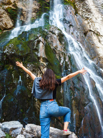 Beautiful and high waterfall. A young woman hikes in the mountains.