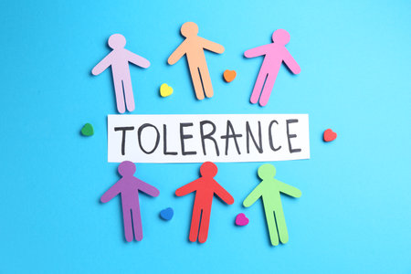Card with word Tolerance, colorful human figures and hearts on light blue background, flat lay