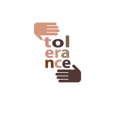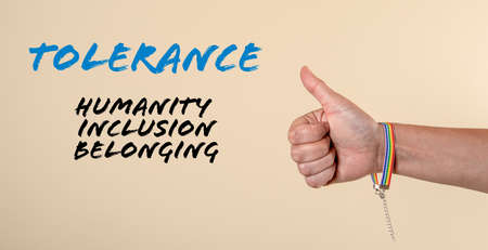 TOLERANCE. HUMANITY, INCLUSION and BELONGING. Womans hand shows the thumb up