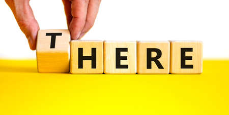 There or here symbol. Businessman turns a wooden cube, changes the word 'there' to 'here'. Beautiful yellow table, white background, copy space. Business, there or here concept.