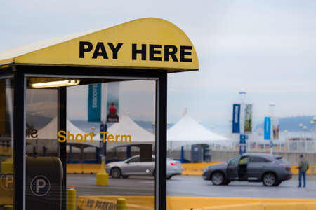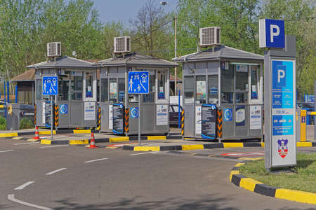 Belgrade, Serbia - April 13, 2018: Entry to public parking lot with pay kiosks cabins at Ada recreation lake.
