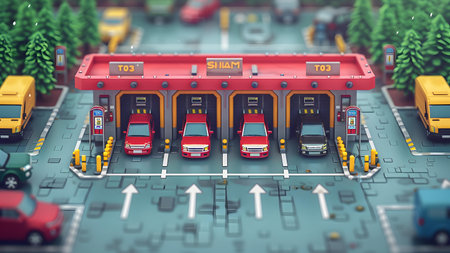 A captivating morning scene featuring a toll booth bustling with vehicles against a backdrop of a clear blue sky and distant urban landscape during sunrise.