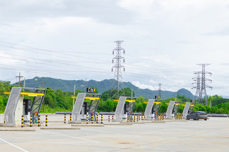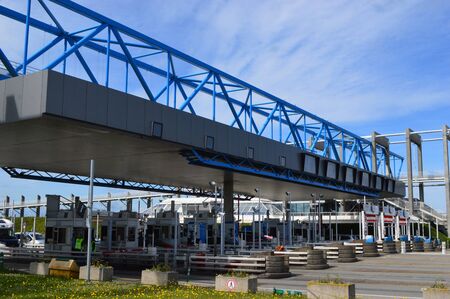 Highway toll gates for car vehicles entry to travel destination in countryside.