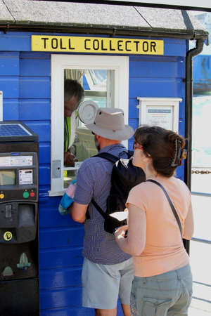 Sandbanks, Dorset, England - June 02 2018: Man and woman queueing in line at the ticket or toll collector booth for the Sandbanks to Shell Bay Chain Ferry which crosses the entrance of Poole Harbour