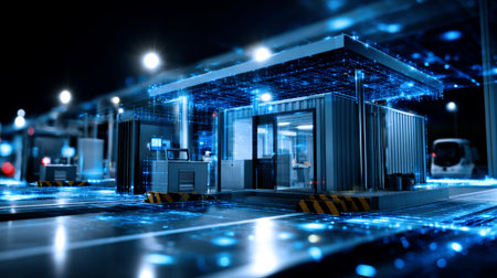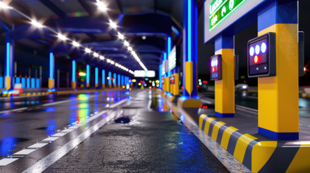 A detailed view of a nighttime highway toll plaza featuring modern electronic signage and illuminated vehicles in a vibrant urban environment.