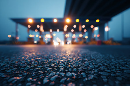 Ground-level view of a gritty road surface with a distant toll plaza glowing warmly. Captured at dawn, the image conveys an industrial highway mood with shallow depth-of-field.