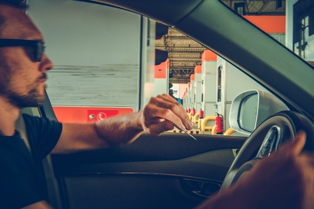 Paying Highway Toll. Men in the Car Paying the Toll. Highway Systems.