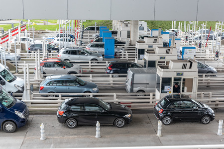 Point of acceptance of payments on the carriageway. Busy toll road, with many cars queuing up to pay tolls.