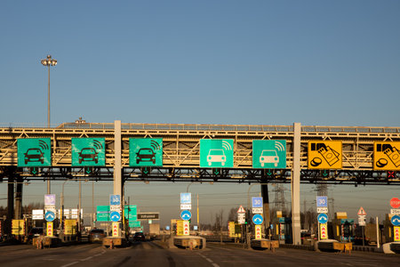 Saint-Petersburg, Russia - December 4, 2016: toll fare on the car on the toll highway Western High-Speed Diameter. Cars waiting in line.