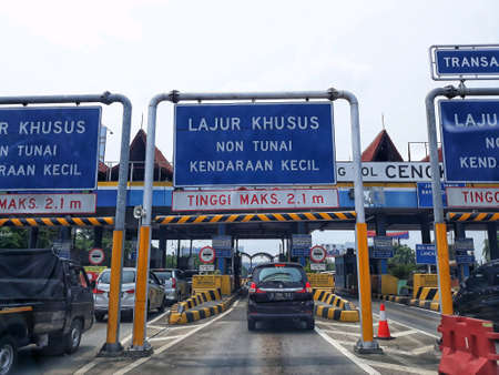 Bangkok, Thailand - May 23, 2017: The cars were queued on express way, tollway or motorway gate for pay toll fee.
