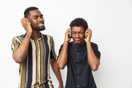 Two joyful African American men showing playful expressions and posing together, conveying happiness and friendship in a bright, clean environment.