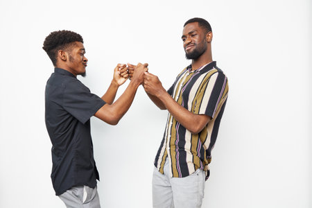 Two young black men with dark skin smiling and talking together in casual clothes on white background. Friendship, communication and positive interaction between friends.