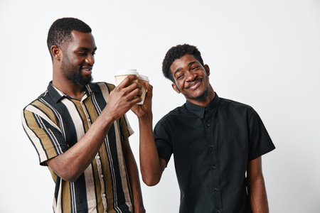 Two young black men with dark skin smiling and holding coffee cups together in casual clothing on white background. Friendship, happiness and relaxed mood in studio.