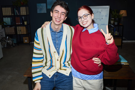 Caucasian young man and Caucasian young woman standing close together smiling at camera, young woman showing peace sign with hand, both appearing cheerful in office setting