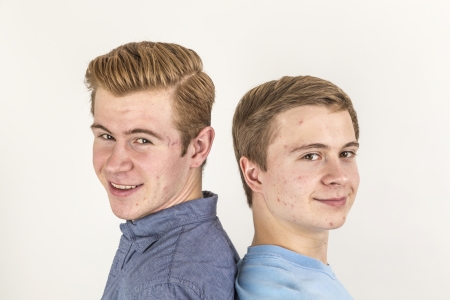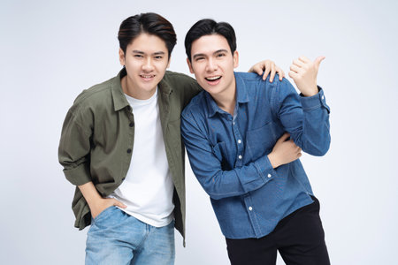 two friends in identical shirts and a t-shirt gesturing with their hands on a blue background
