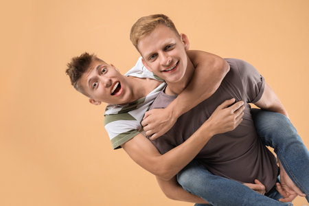 Two smiling African American men share a joyful moment, displaying friendship and camaraderie on a simple white background, with stylish outfits and playful expressions.