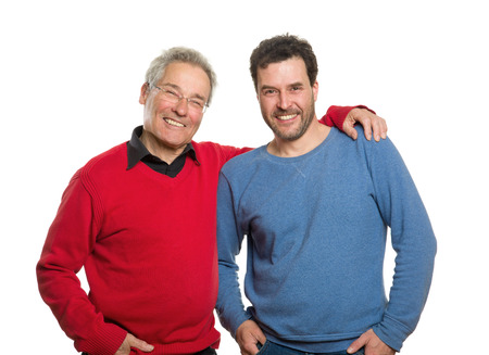 Two Caucasian men, a mature adult around 40 years and a senior, in red and blue pullovers. Generation portrait, father and son. Isolated on white background.