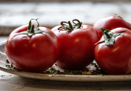 juicy red tomatoes close-up, on a plate with blur effect,