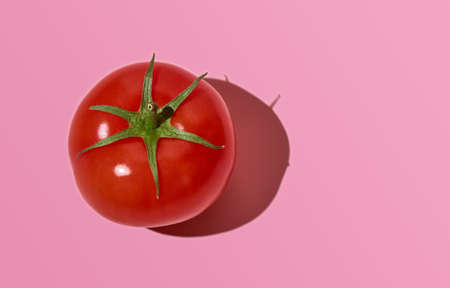 A red ripe healthy tomato lies on a pink background. Hard light, deep shadow. Close up, top view, copy space.