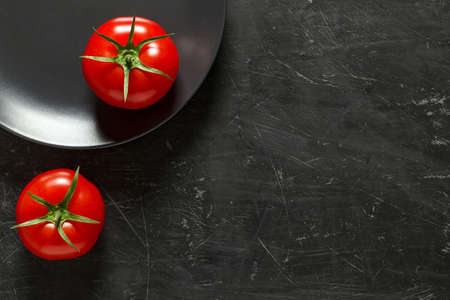 Bright, red and ripe tomato on dark grey background.
