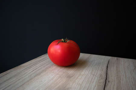 Single ripe red tomato lying on a wooden board against black background