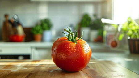 A fresh tomato with water droplets sits on a cutting board in a bright and modern kitchen, surrounded by greenery.