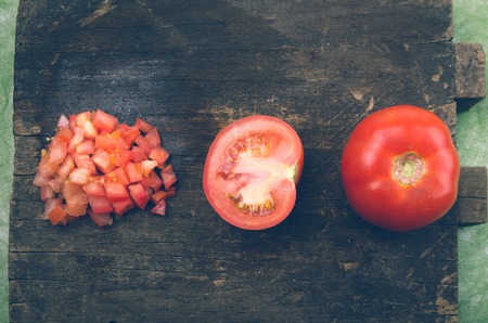 organic and delicious tomatoes whole chopped on wooden board.