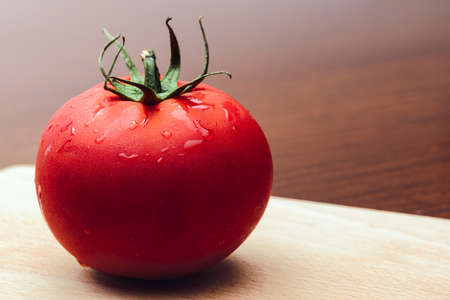Red tomato on a cutting board on the wooden background. Copy space. Fresh tomato for cooking. Tomato with droplets of water.
