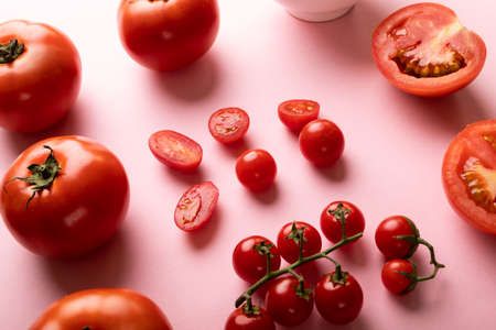 High angle view of fresh tomatoes and cherry tomatoes on pink background. unaltered, food, healthy eating, organic concept.