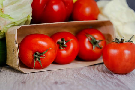 Fresh tomatoes in a box on a light countertop on a background of cabbage and lettuce. Still life, composition of fresh vegetables.