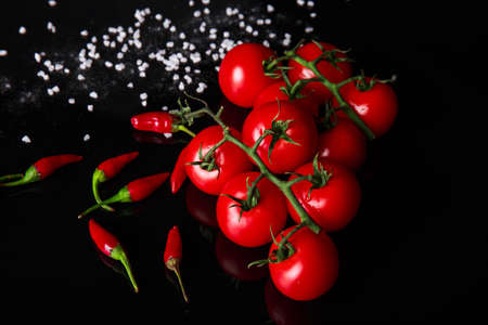 Top view of fresh red tomatoes and hot chili peppers on a black stone background. Nutritious, and spicy vegetable ingredients.