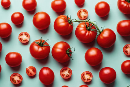 AI Generative Flat lay pattern of ripe tomato vegetable, top view on summer organic fresh background