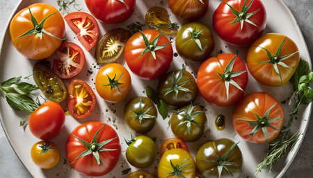 Ripe and fresh heirloom tomatoes with olive oil and herbs