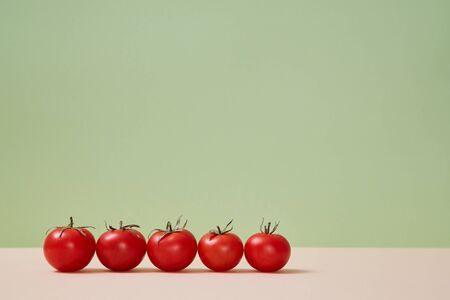 Ripe red tomatoes in row on light beige ground. Healthy lifestyle. Diet food. Copy space. Pastel green background
