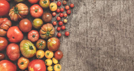 Organic multicolored untreated tomatoes on a dark table, top view with copy space