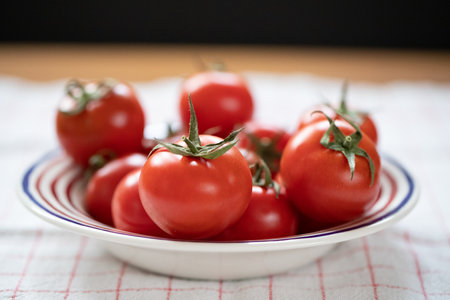 juicy red tomatoes close-up, on a plate with blur effect,