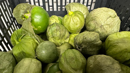 Green tomatillos in a basket on a market stall in Italy
