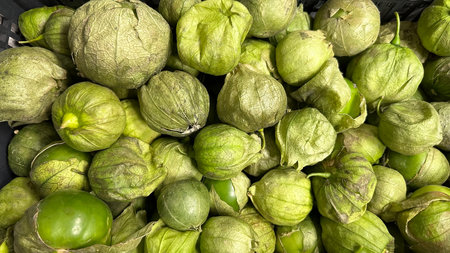 Heap of fresh green tomatillos in the market, top view