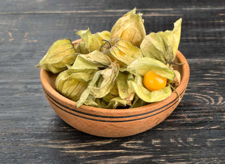 Bowl filled with fruit physalis in a peel on a table