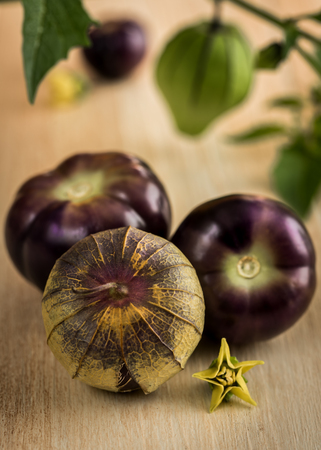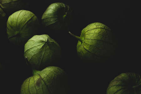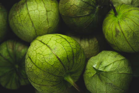 Macro close up portrait of tomatillo, Mexican husk tomato, selective focus