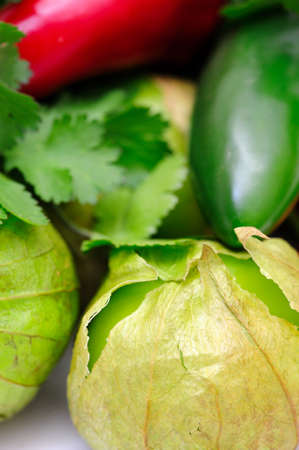 Ripe tomatillos cilli peppers and cilantro ready to be used for ingredients for Mexican salsa verde.
