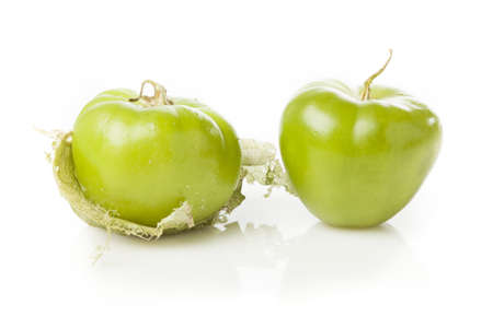 A pair of unripe green tomatoes isolated on white