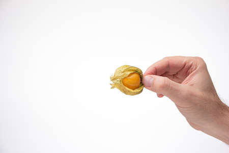 Caucasian male hand holding a ripe physalis fruit. Close up studio shot, isolated on white background.
