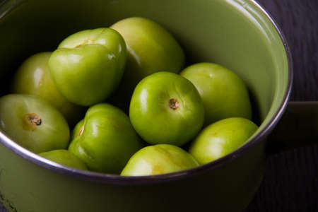 Tomatillos, green tomatoes, Mexican cuisine ingredient on a dark rustic wooden background