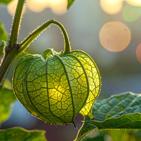 The warm, golden light of a setting sun filters through the delicate, papery husk of a green physalis fruit, illuminating its intricate veins.