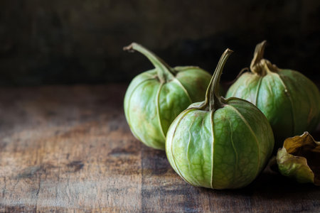 Three vibrant green tomatillos sit on a rustic wooden table showcasing their smooth textured skin and distinct husks. Soft natural lighting highlights the vegetables revealing their earthy tones and the rustic charm of the wooden surface underneath